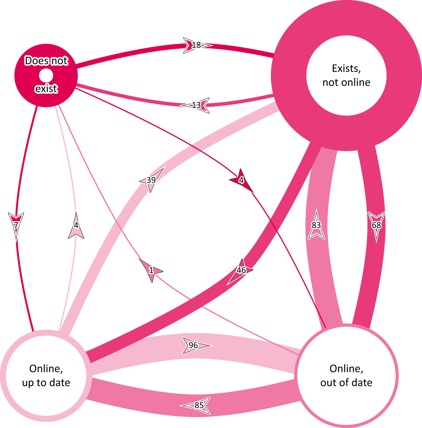The rings’ outer diameters represent the numbers in each status in 2014. Inner diameters represent the amount of ‘churn’, i.e. the sum of the numbers that left or entered this status since 2012.