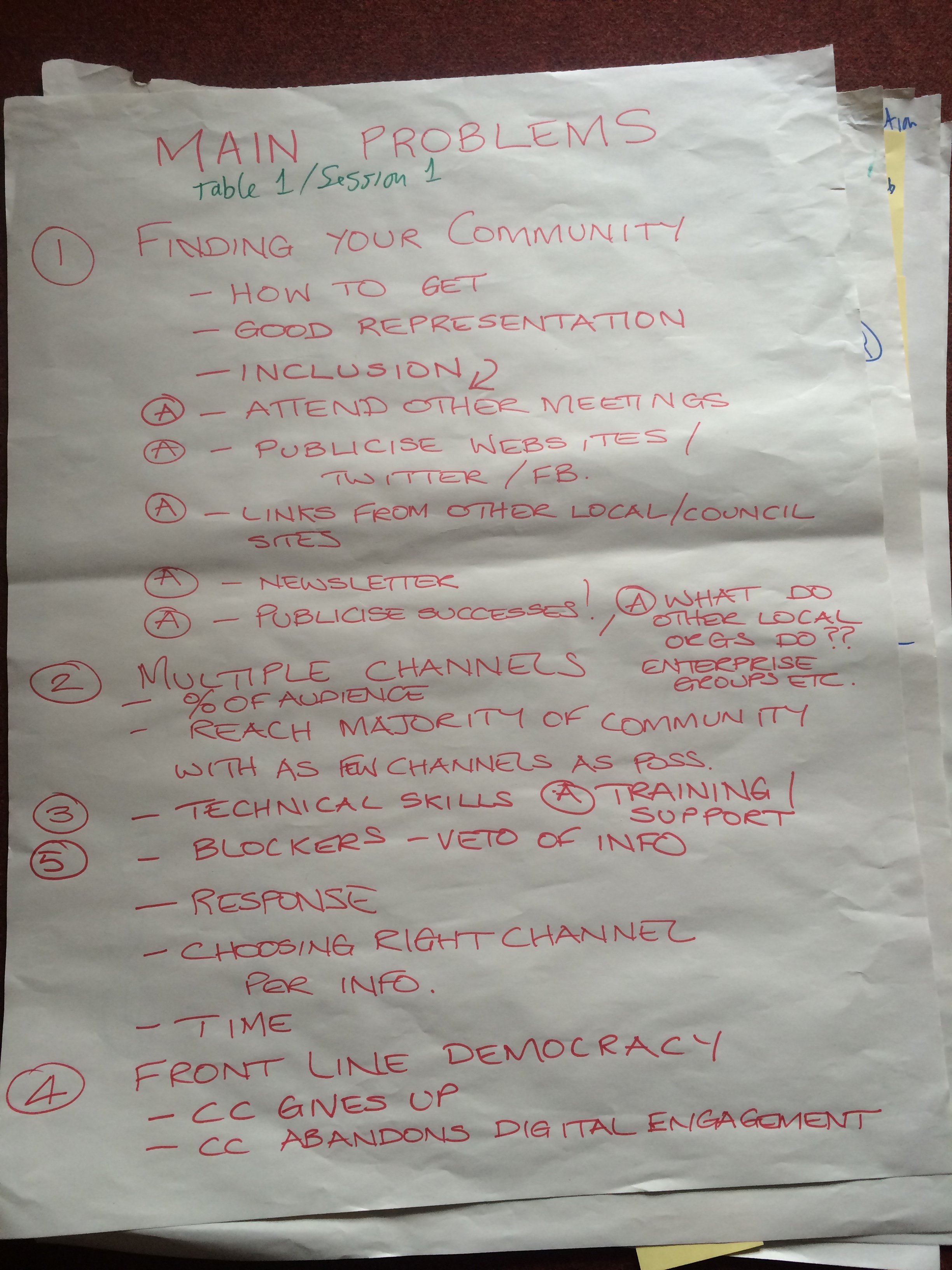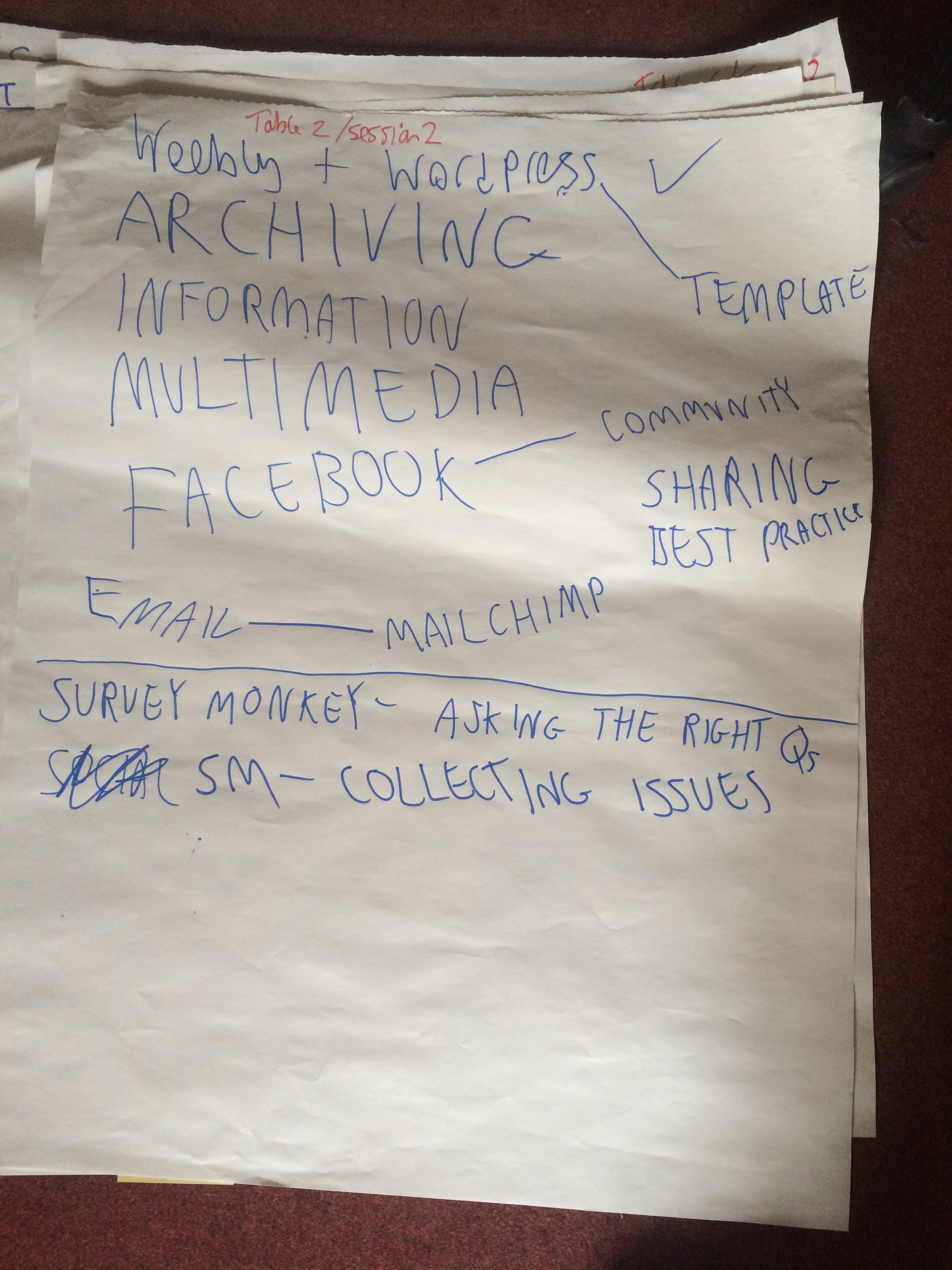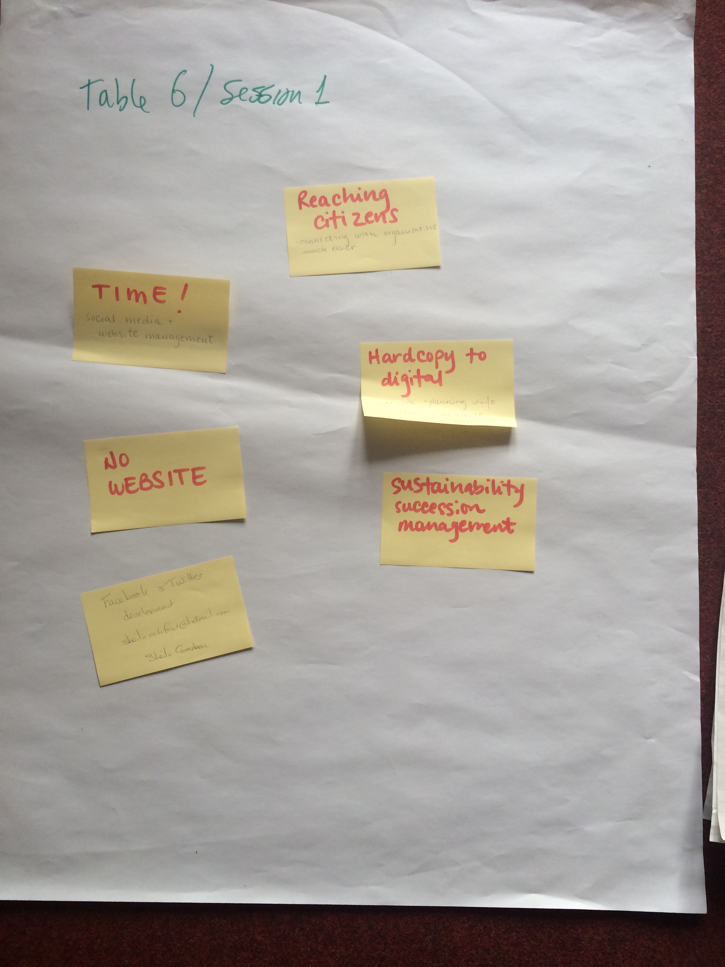 The aim of this session was enabling delegates to talk about the subjects that were important to them, and building relationships with other delegates who were interested in similar topics. From the choices made at registration, 6 groups were created: (1) Facebook (2), Facebook/analytics, (3)Twitter and other SocMed, (4) websites and blogs (5) solution finding and emails (6) training.