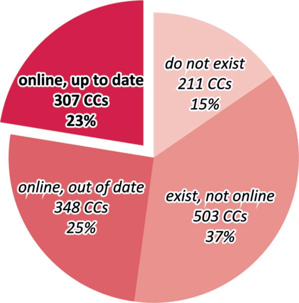 The rings’ outer diameters represent the numbers in each status in 2014. The rings inner diameters represent ‘churn’, i.e. the sums of the numbers that entered and left this status since 2012. The biggest change was that 68 CCs who had merely existed in 2012 had out-of-date internet presences by 2014. This means they must have started their internet use after the 2012 survey but effectively abandoned them by early 2014. We are currently formulating projects to understand why this happens and what might be done to support CCs’ sustained internet use.
