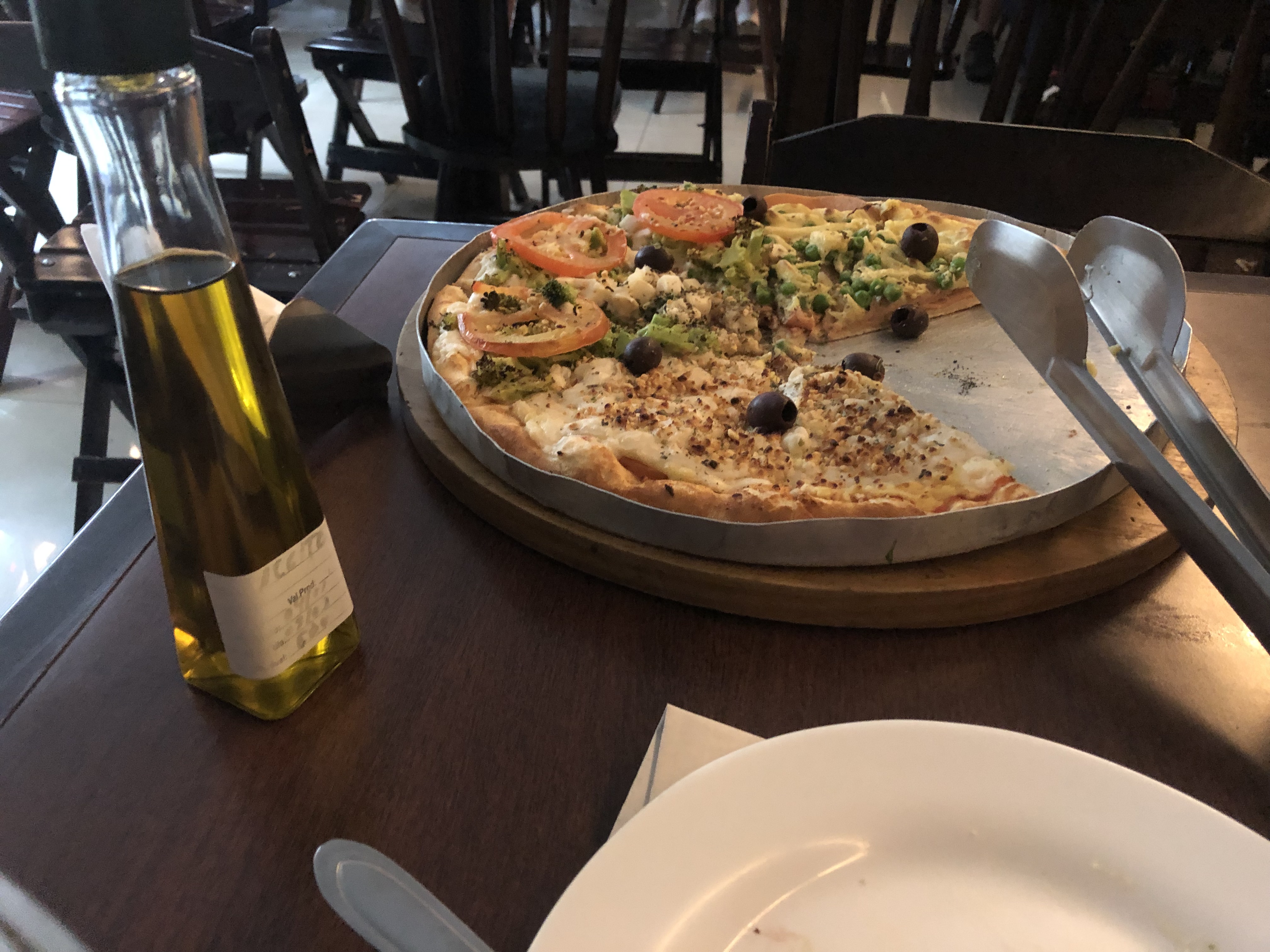 - Portuguesa (Fresh tomato sauce, sliced smoked vegetable ham, caramelized onion, peas, Vegapop, oregano and black olives)