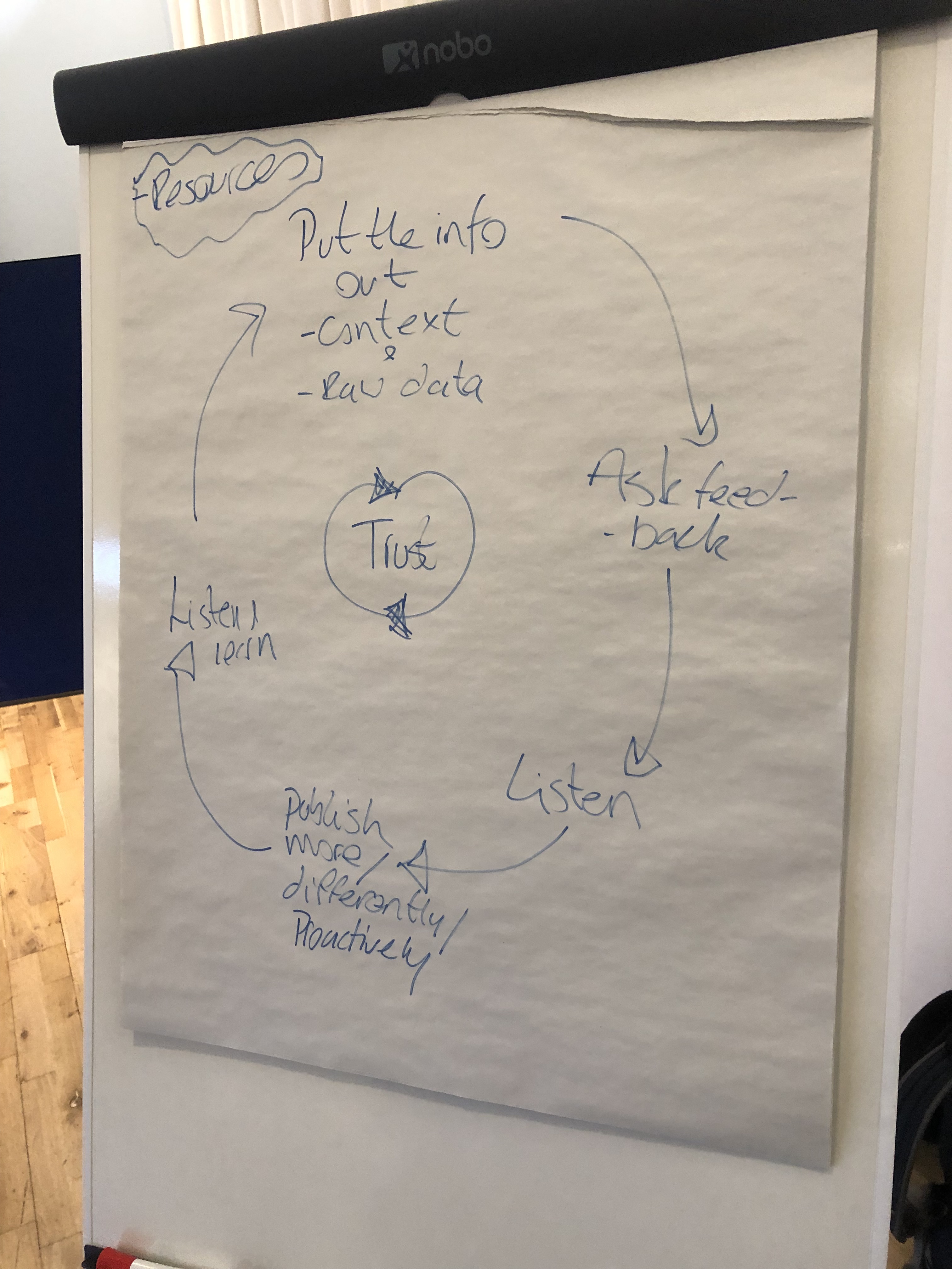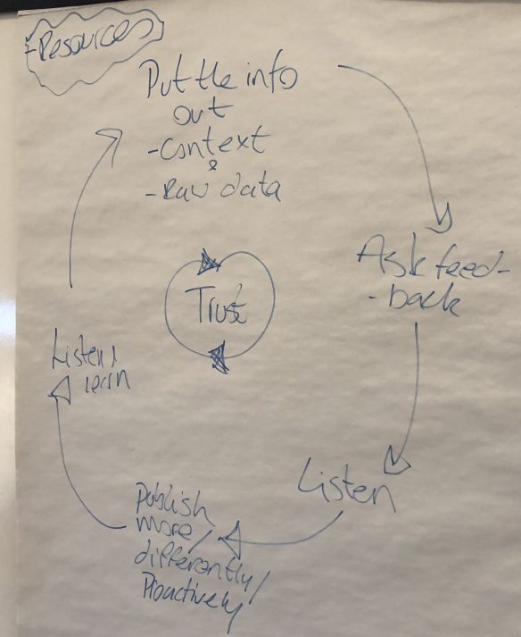 Our table noted that transparency is not a one-off event, it’s a process or evolution. It also needs two-way communications: publishing data, then hearing what can be done better. Our table’s facilitator summed up our thoughts as shown in the photo: