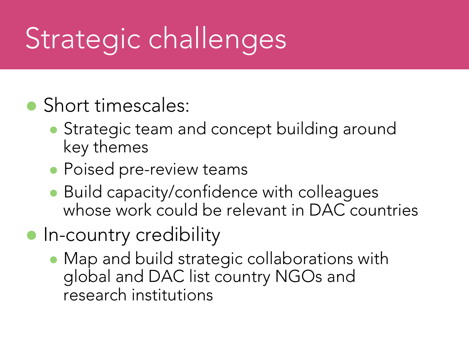 The project team should be in place as soon as possible, because the windows for submitting applications are often very short. This includes getting ‘pre-reviewers’ (people who can comment on the likely success of an application, often dedicated research-support colleagues) in place. Pre-reviewers may also be non-academics. Another valid part of team-building is building capacity with colleagues who are relevant to DAC countries. This and other ‘strategic challenges’ are shown in Figure 4 below.