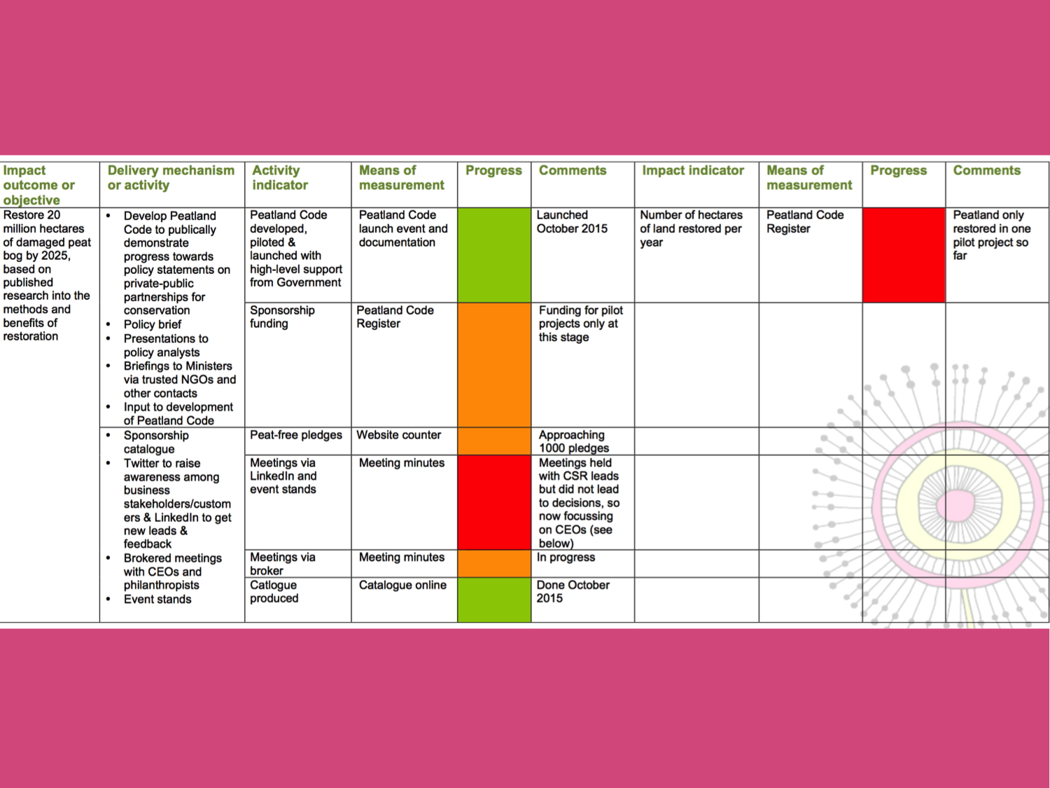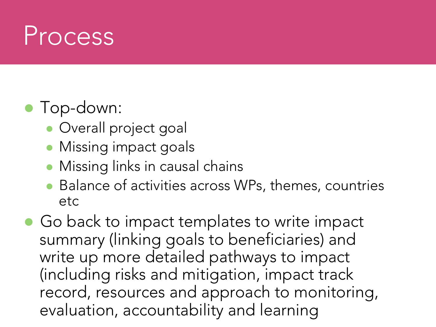 - ensure there is at least one activity leading to each impact goal.