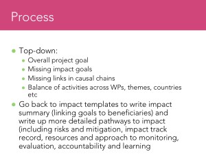 Mark replied that increased ‘awareness and understanding’ impacts on their own are worthwhile but will not score highly with GCRF funders. They also need more tangible benefits such as ‘increased awareness and understanding, leading to better wellbeing, increased security, better decisions.