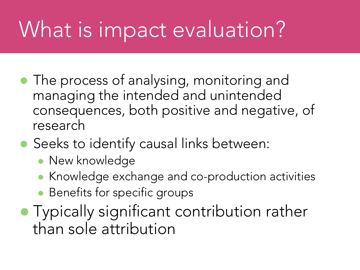 Impact is the benefit of research. Hence it is not the pathways to impact, but what the research project will actually do for people and other beings. So impact is the aim that underpins research.