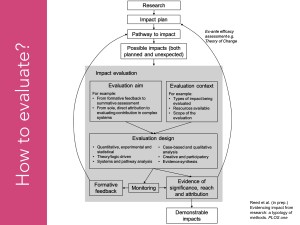See also chapter 22 of the Research impact handbook. A definition of evaluation is given in Figure 14 and a way of using evaluation to demonstrate impact is given in Figure 16.