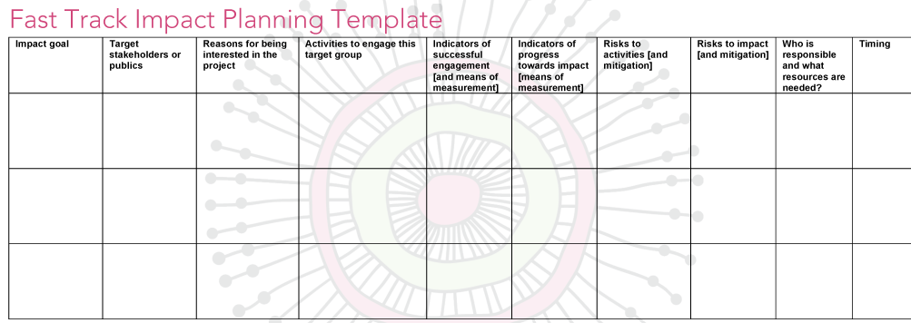 Use the impact planning template ((Word | PDF | Figure 8 below) to create a plan for impact. (This includes a worked example.)