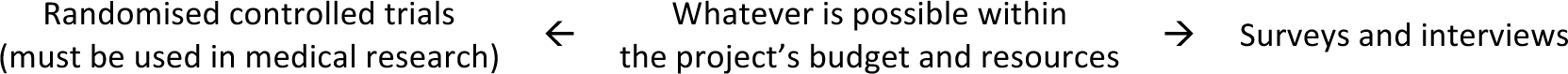 Researchers will need to design their evaluation techniques. This is analogous to research design, which researchers should be good at anyway. Failing that, they should know colleagues who are good at it. Evaluation techniques have a spectrum of rigorousness, as shown in Figure 16: