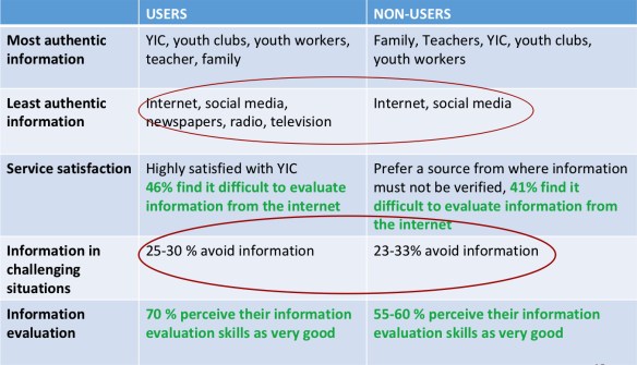 Gunilla and colleagues have some interesting results on information reliability and evaluation (Figure 2). This data covers users and non-users of Youth Information Centres.
