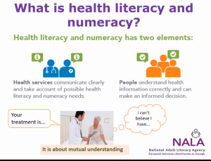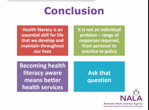 Inez noted some useful resources, and the importance of checking that people have understood what has been said. She concluded that health literacy is a lifelong essential, needing a range of responses, but leading to better (health) services.