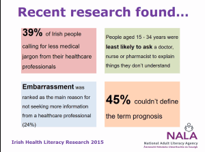 There was also an EU Health Literacy survey in 8 countries. It found that 10·3% of respondents had ‘inadequate’ health literacy and 29·7 had ‘problematic’ health literacy. Here are Inez’ reasons why that is so important and frightening! The slides about the Irish findings really chimed with some things I have learnt about some people with diabetes.