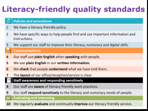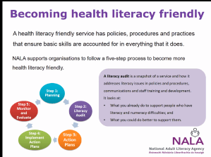 So Inez then looked at ‘Delivering a health-literacy friendly service’. Part of the way to do that is for healthcare professionals to audit themselves, to find and then address issues. Another part is development of literacy-friendly quality standards.
