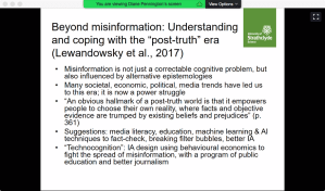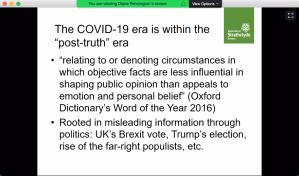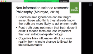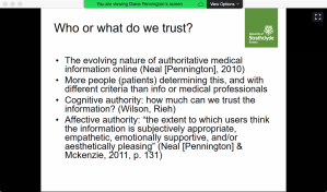So there are some questions to consider. These are as-yet unrefined precursors to actual research questions. (Diane also noted that mask-wearing is common in China.) So an important question is ‘Who or what do we trust?’ This is reminiscent of the poll earlier. She also talked about ‘cognitive authority’ – her example was male doctors talking about endometriosis, a condition which they cannot personally experience. She stated that coronavirus is within the ‘post-truth’ era. I hate that term and everything it stands for. She then looked at some philosophical precedents.