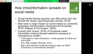 Diane mentioned a personal experience of being in a filter-bubble. I think everyone needs to know your enemy. (That’s my obligatory Manics reference for today.)‘ Diane talked about how misinformation spreads, including desire for ‘dopamine hits’ from social media hits. She said that we shouldn’t just blame the algorithms underpinning what we see on social media but also our own choices. (I think ‘don’t blame the algos – get to the humans that create them!’) Diane also said we should watch out for sources that claim to debunk misinformation. Does anyone remember the Conservative Campaign HQ fact-check hoo-hah? Diane noted some facts from the World Health Organisation, and asked whether lies lead to more lies. I asked whether we knew that since early childhood. Diane later replied ‘Thats what I thought – at least, my parents taught me that!’