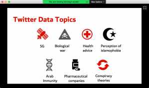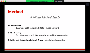 This was actually a multi-slide presentation. As Ashwag and Aseel put it in an earlier tweet: ‘Uncertainty fuels coronavirus #rumors and #misinformation. We seek to understand the #Arabic misinformation spread the most in this #COVID pandemic and how misinformation evolve over time.’ Here’s their opener slide and their research questions.