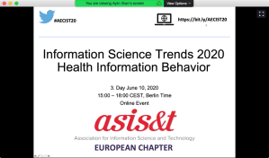 I recently attended an European chapter of ASIS&T Information Science Trends online conference This year it focussed on health information hehaviour. The following are my digitally-assisted memories of #AECIST20, i.e. adaptations of my live-tweets from the event. As ever, this report is mostly to help me sort what I need to do from what I want to do after being stimulated by many fascinating presentations. Any mistakes or misrepresentations in the below are of course my mistakes.