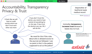 - ‘ownership and property’: when the system was first implemented, patients could only see records signed by doctors. But patients wanted to see all data about themselves.