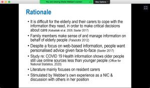 Sheila and Pamela started their presentation by noting that non-resident carers often have to do a lot of travel. Here are the aim and definitions of the work they are reporting on. Then there is the rationale for the work. (Gosh, I’ve lived some of these!) Part of the rational is the need for personalised advice for carers: different age-groups need (in general) different ways to receive information.