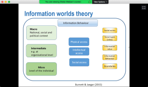 - Someone noted that much of Inez’s presentation was all about quantitative data, and suggested that literacy as a social practice can’t/shouldn’t be ‘measured’. If we can’t at least assess how well a person is or people are doing, we can’t know whether measures to support them are effective. Having said that, I know – from trying to do so – that measuring workplace information literacy can be very difficult!)