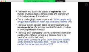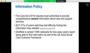 Sheila and Pamela talked about the ‘information worlds’ theory: this includes social contexts and interactions between small worlds and other factors. The overall environment, includes the policy background(s). Note the different levels of devolution – these cause problems. Also, the UK government is trying for a more free-market ethos. (I have no polite words for that!) According to the Care Act 2014 (actual law on legislation.gov.uk, information from the Social Care Institute for Excellence), there should be information for carers but it’s hard to find. Also the demographics of people receiving care are challenging – sometimes old people are seen as a problem.