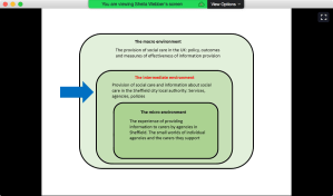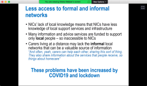 Concerning the micro-environment, there is less contact into the small worlds of agencies. There are big learning journeys for carers. But there is less access to formal and informal networks. For example, some care support groups may not admit people from outwith their local areas.