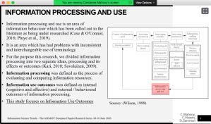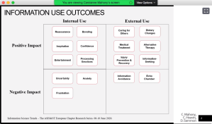 Here is the team that undertook this project. The background was health information seeking. Carolanne noted the move from ‘paternalistic’ to ‘online/ubiquitous’ information-provision, including issues around quality/standards of information available online. Those patients who look for information are seen to be more engaged. But there are problems due to lack of internet access for some. Carolanne positioned the research in terms of Wilson’s general model of information-seeking: information processing and use (Dear me, I have so much reading and learning to do!) focussing on information use outcomes (That interests me too – what do you do with information you have found?)