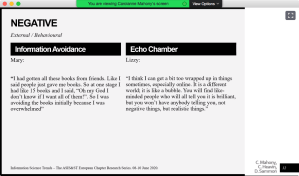 Concerning outcomes, i.e. the effects of information-seeking (such as ability to articulate things), Carolanne presented the following results. The slide does not mean that the number of positive outcomes is larger than the number of negative outcomes. (@gemmaducat, @Bruce_Research: note information avoidance!)