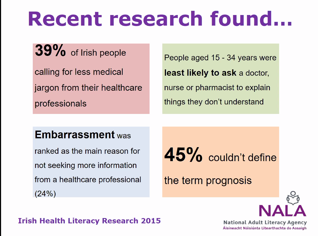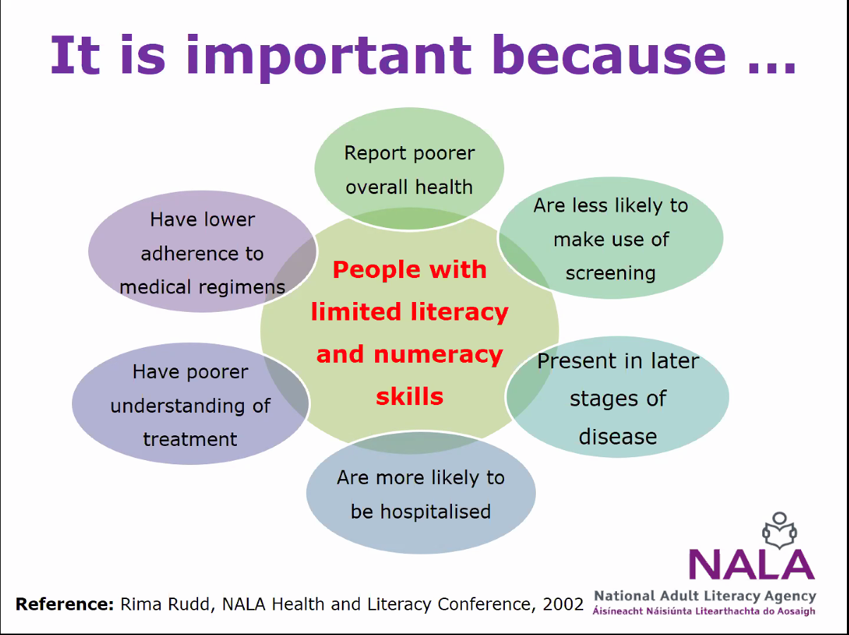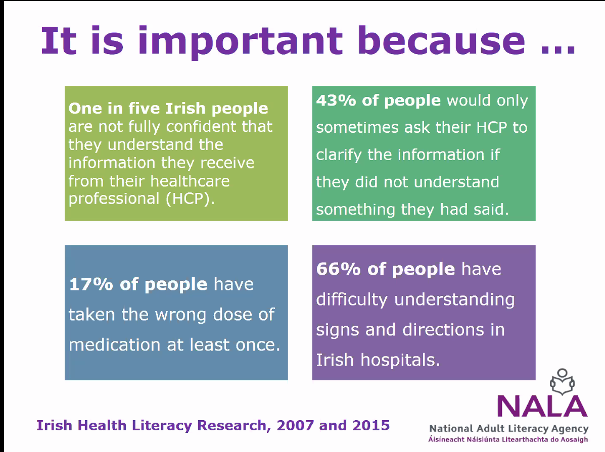 There was also an EU Health Literacy survey in 8 countries. It found that 10·3% of respondents had ‘inadequate’ health literacy and 29·7 had ‘problematic’ health literacy. Here are Inez’ reasons why that is so important and frightening! The slides about the Irish findings really chimed with some things I have learnt about some people with diabetes.