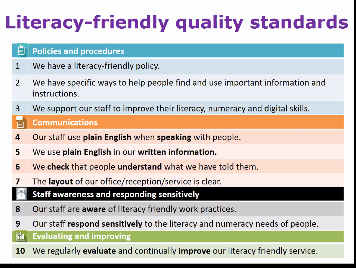 So Inez then looked at ‘Delivering a health-literacy friendly service’. Part of the way to do that is for healthcare professionals to audit themselves, to find and then address issues. Another part is development of literacy-friendly quality standards.