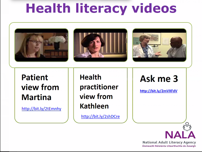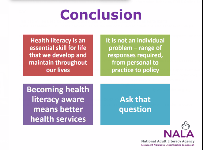 Inez noted some useful resources, and the importance of checking that people have understood what has been said. She concluded that health literacy is a lifelong essential, needing a range of responses, but leading to better (health) services.