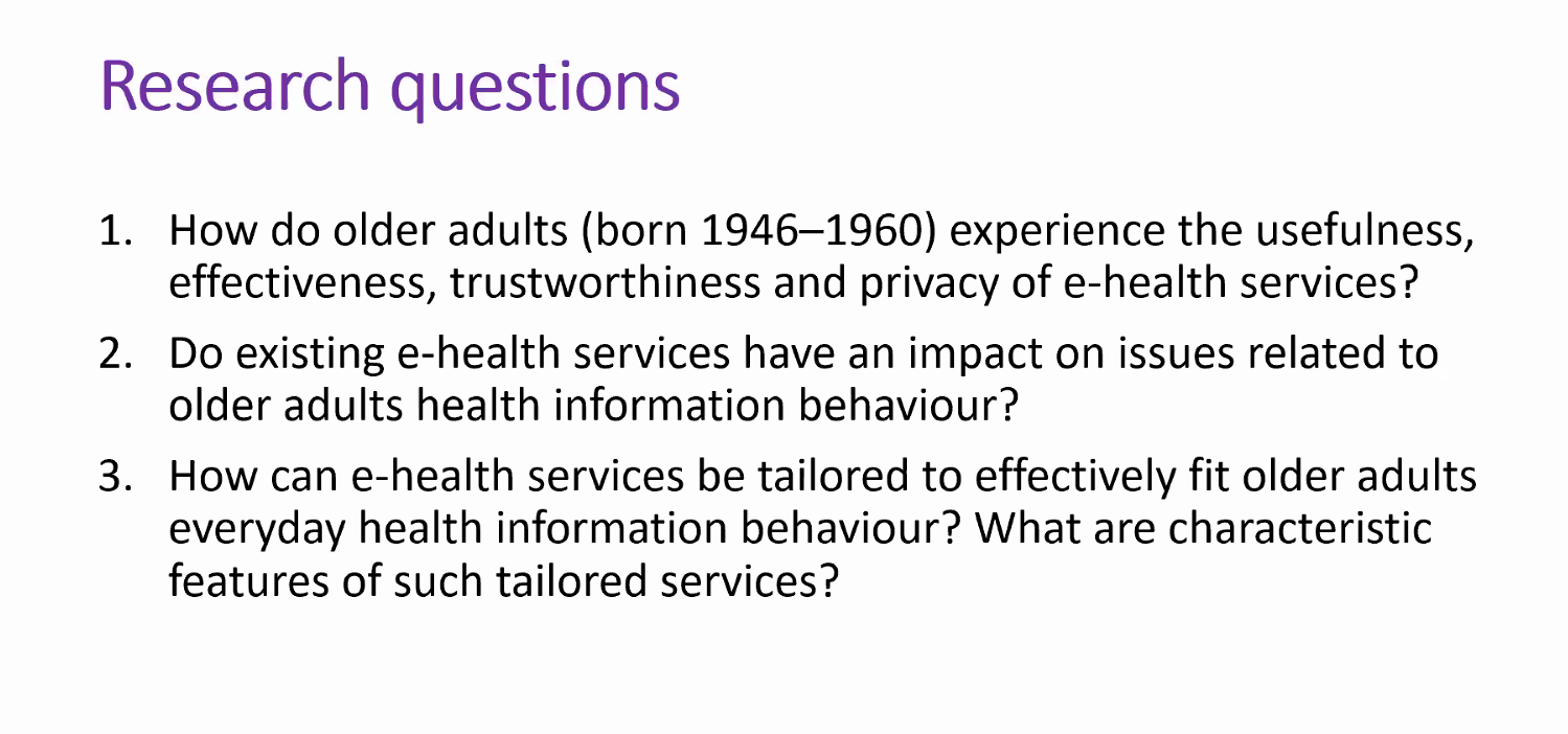 The presentation was given by Heidi Enwald. Here is the research-team, and a note that this research has a social aim, and research questions: