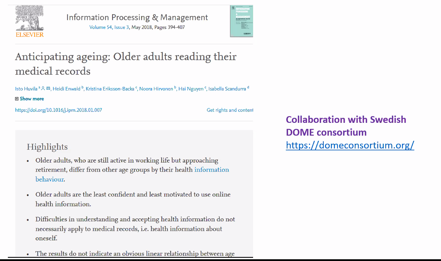 Heidi Enwald; Kristina Eriksson-Backa; Noora Hirvonen; Isto Huvila: Taking health information behaviour into account in user-centered design of e-health services – key findings from an ongoing research project
