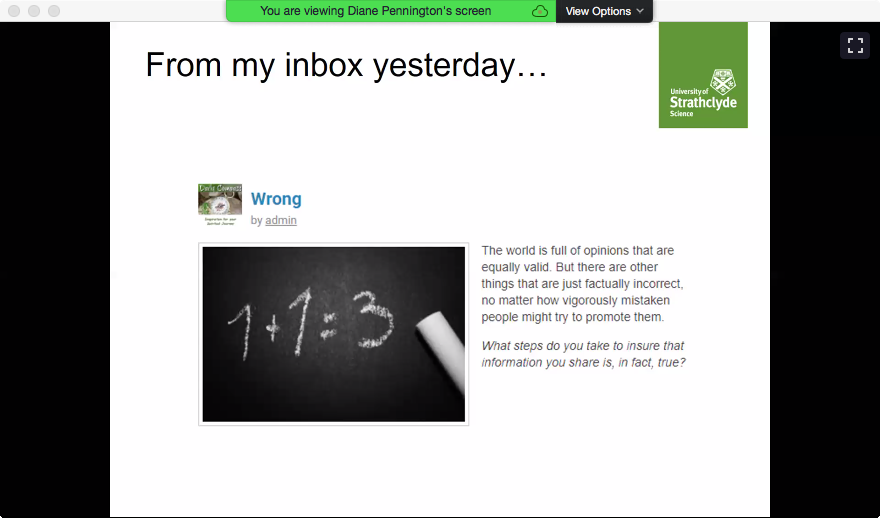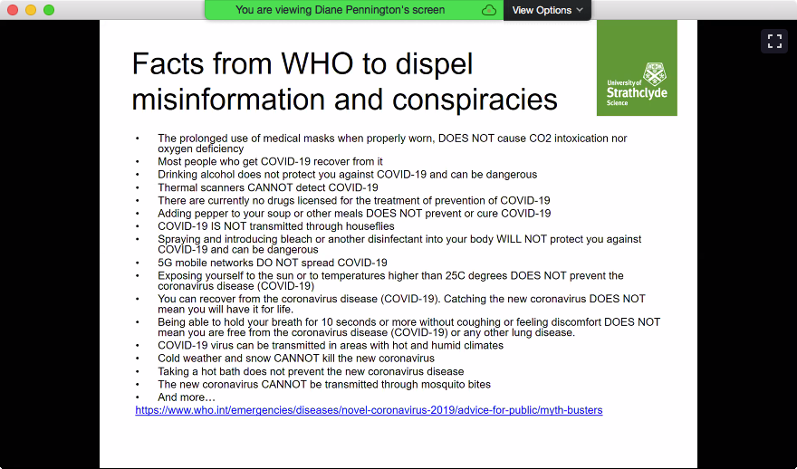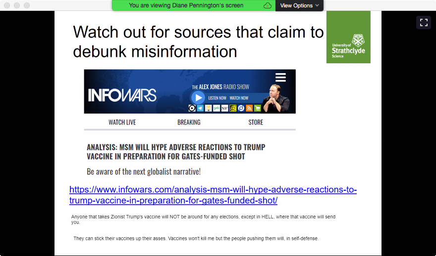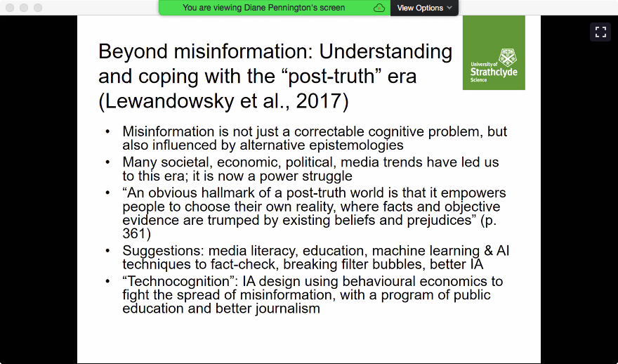 Diane mentioned a personal experience of being in a filter-bubble. I think everyone needs to know your enemy. (That’s my obligatory Manics reference for today.)‘ Diane talked about how misinformation spreads, including desire for ‘dopamine hits’ from social media hits. She said that we shouldn’t just blame the algorithms underpinning what we see on social media but also our own choices. (I think ‘don’t blame the algos – get to the humans that create them!’) Diane also said we should watch out for sources that claim to debunk misinformation. Does anyone remember the Conservative Campaign HQ fact-check hoo-hah? Diane noted some facts from the World Health Organisation, and asked whether lies lead to more lies. I asked whether we knew that since early childhood. Diane later replied ‘Thats what I thought – at least, my parents taught me that!’