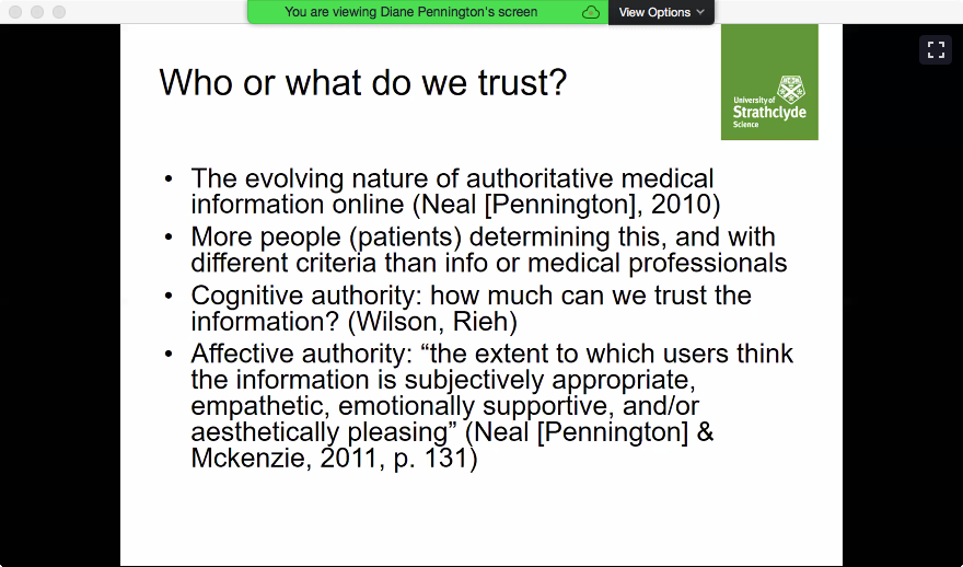 Kaitlin gave some examples of collaborative crosschecking, ofevaluation techniques that users shared and of emotion-work. Collaborative crosschecking is where users attempt to teach others how to combat misinformation by sharing their own searching and evaluating skills. NB ‘watch the pages’ (not eh ‘evaluation’ slide means ‘only trust authoritative sources, e.g. ‘.gov’. I want to ask Roger Water’s question ‘Should I trust the government?‘ See later for when I actually did. Another commenter said ‘interesting focus on emotional work in “correcting” people/teaching people more appropriate information skills and ways of engaging with health information’.