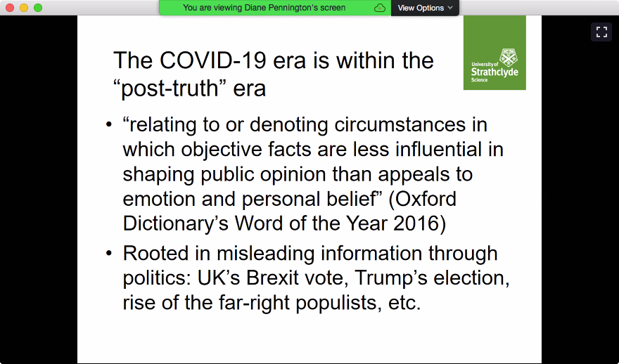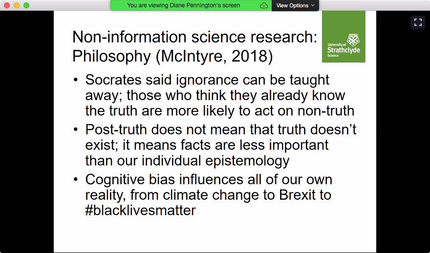 So there are some questions to consider. These are as-yet unrefined precursors to actual research questions. (Diane also noted that mask-wearing is common in China.) So an important question is ‘Who or what do we trust?’ This is reminiscent of the poll earlier. She also talked about ‘cognitive authority’ – her example was male doctors talking about endometriosis, a condition which they cannot personally experience. She stated that coronavirus is within the ‘post-truth’ era. I hate that term and everything it stands for. She then looked at some philosophical precedents.