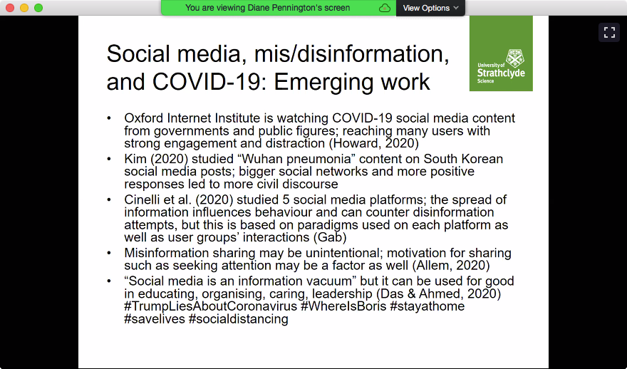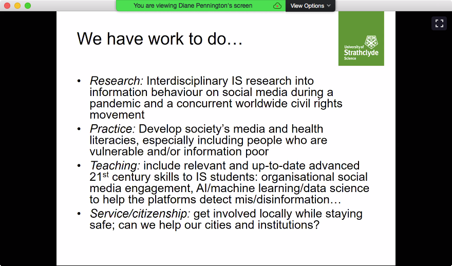 Diane started by noting that her thinking is evolving. When she agreed to give this keynote, we had ‘only’ coronavirus to deal with. Now we have civil rights issues coming to the fore. She asked ‘what steps can you take to make sure information is correct?’, and stated that misinformation is a core problem. She mentioned lies by a certain ‘world-misleader‘. NB ‘world-misleader‘ is my term, and was not said by Diane – she described this person in factual terms only. Meanwhile here is some data on coronavirus, and a classification of types of misinformation. (She also mentioned the digital divide.) Diane’s point here is that global crises are also information crises.