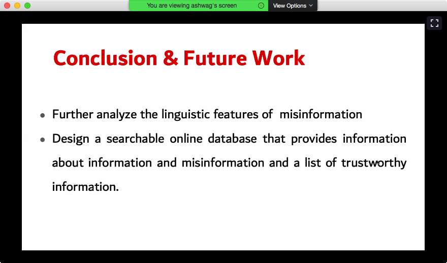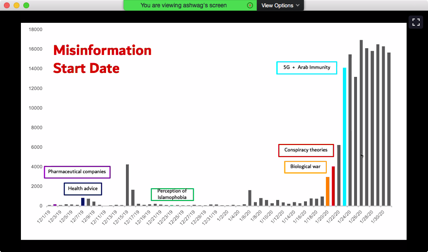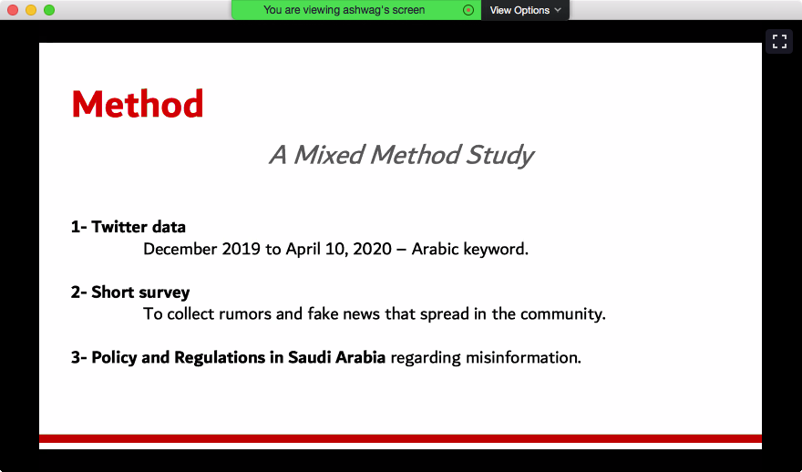 This was actually a multi-slide presentation. As Ashwag and Aseel put it in an earlier tweet: ‘Uncertainty fuels coronavirus #rumors and #misinformation. We seek to understand the #Arabic misinformation spread the most in this #COVID pandemic and how misinformation evolve over time.’ Here’s their opener slide and their research questions.