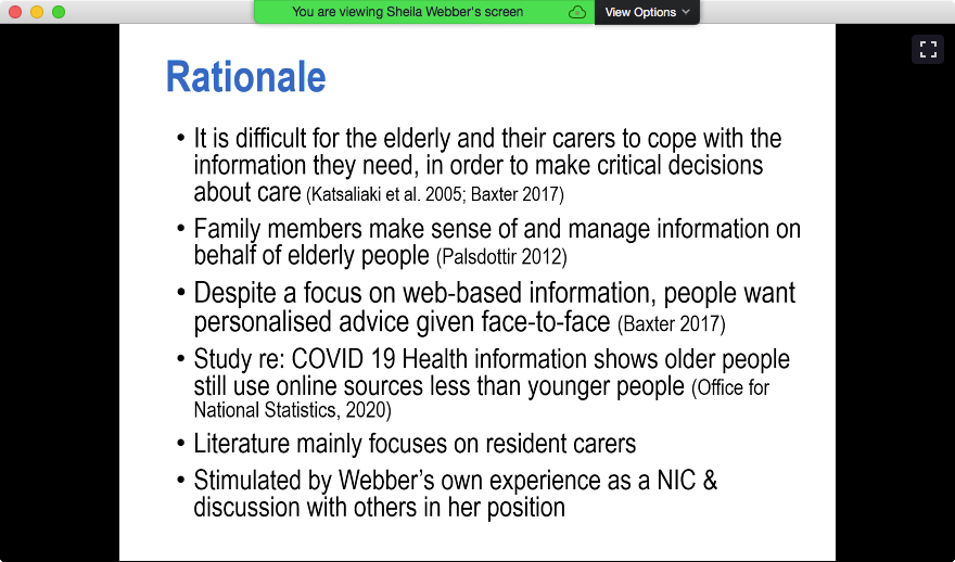 Sheila and Pamela started their presentation by noting that non-resident carers often have to do a lot of travel. Here are the aim and definitions of the work they are reporting on. Then there is the rationale for the work. (Gosh, I’ve lived some of these!) Part of the rational is the need for personalised advice for carers: different age-groups need (in general) different ways to receive information.