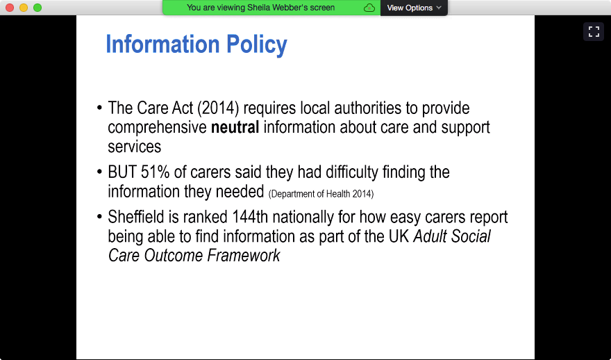 Sheila and Pamela talked about the ‘information worlds’ theory: this includes social contexts and interactions between small worlds and other factors. The overall environment, includes the policy background(s). Note the different levels of devolution – these cause problems. Also, the UK government is trying for a more free-market ethos. (I have no polite words for that!) According to the Care Act 2014 (actual law on legislation.gov.uk, information from the Social Care Institute for Excellence), there should be information for carers but it’s hard to find. Also the demographics of people receiving care are challenging – sometimes old people are seen as a problem.