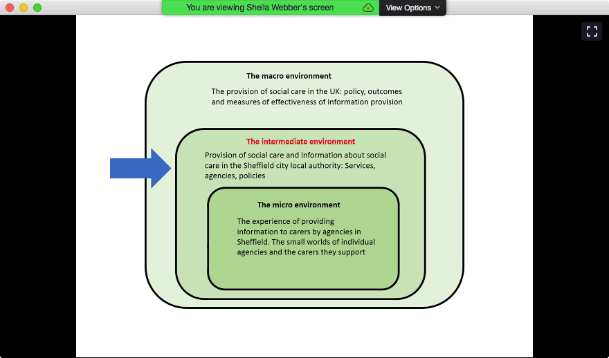 Concerning the intermediate environment (in this case Sheffield city local authority, services agencies, policies etc), there is much signposting. And many people start and finish being carers (presumably for members other families) each year. Also large difference between how different local authorities operate leads to issues.