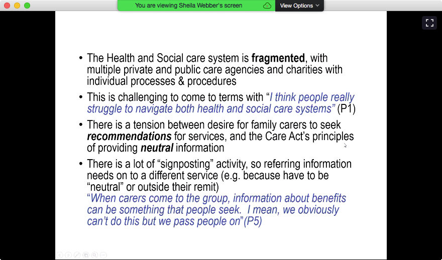 Sheila and Pamela want to extend their work, for example by collaborating with people in other areas. They talked about the greatest needs of informal carers. (I can’t write about this just now without feeling very emotional.) One issue is finding out what you need to know. During the Q&A session, Sheila and Pamela talked about the ‘fun’ of getting funding (I know this one too!), and the difficulties of investigating ethically. Their experience is that some participants will give a lot of information, but some of that information may break ethical considerations.