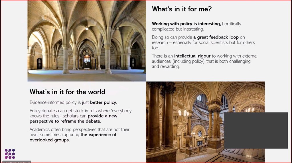 Working with policy community. Policy-engagement is far more than sitting at horse-shoe table giving advice to MSPs. It goes from UK Parliament down to community level.