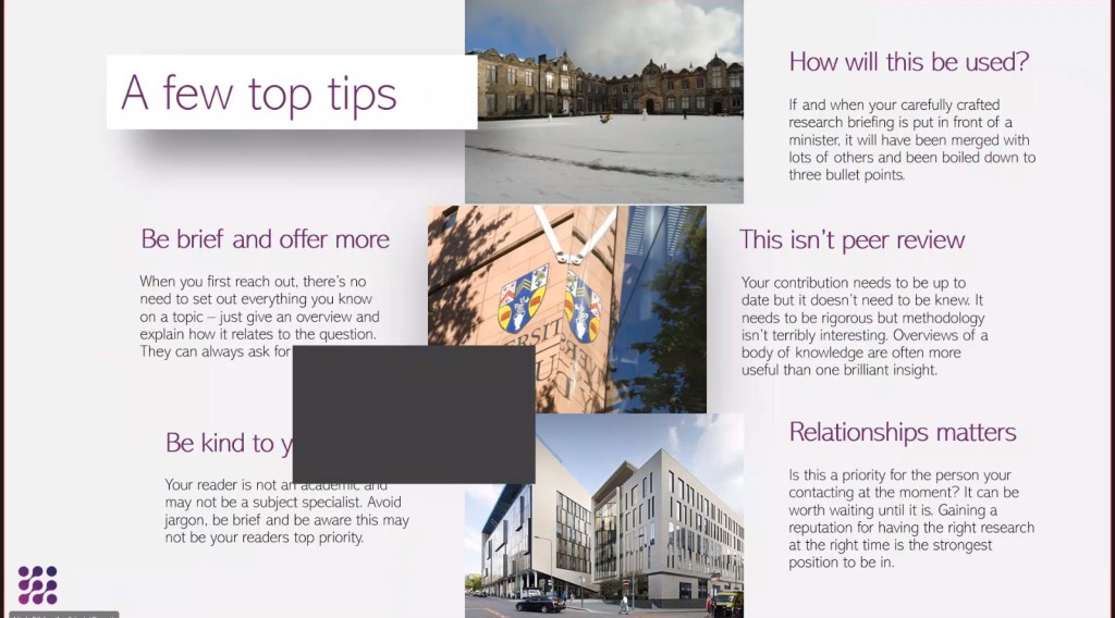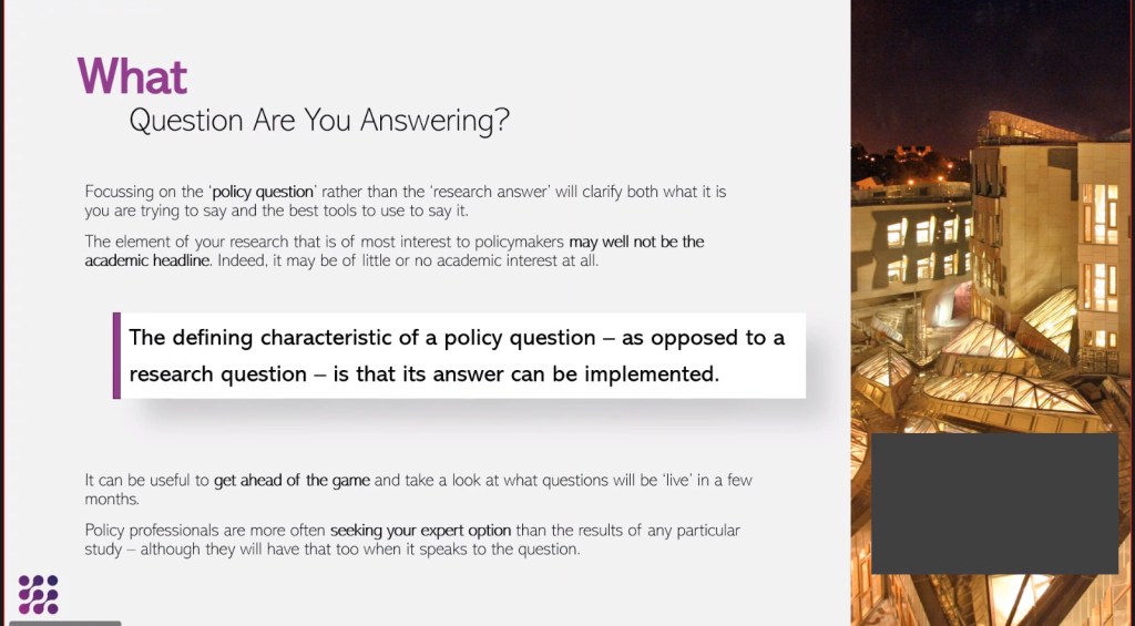 This online session, hosted by Queen Margaret University on 24 November, provided an overview of how to get research noticed by government and other policy institutions. The ‘research questions’ were