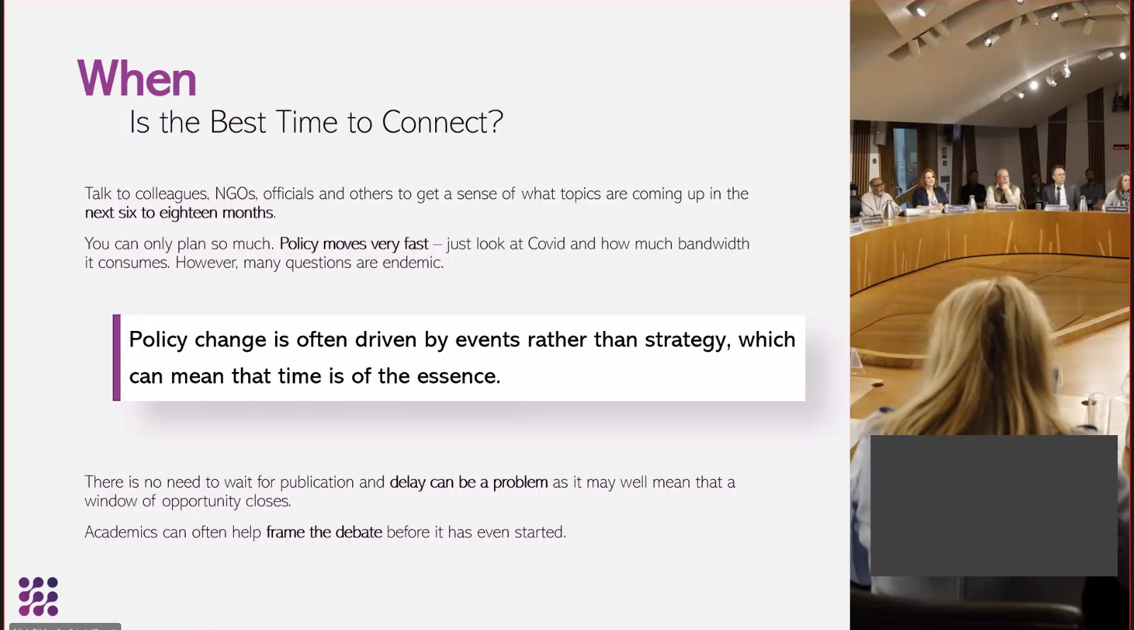 Say if you’ve done a study, then want to get it into policy-sphere. Don’t do ‘my research says…’. Instead, look for live or forthcoming issues that the work can address.