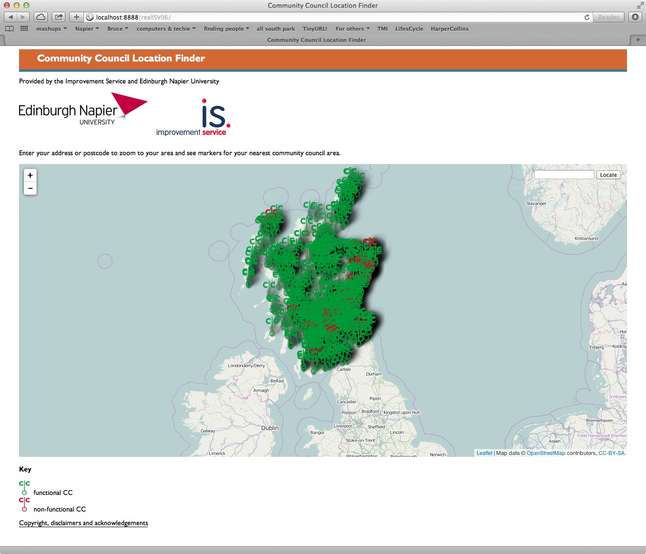 I started by knocking up some css and a disclaimer/copyright page and some custom markers for functional and non-functional CCs – easy, if not the prettiest thing ever. Then I followed the recipe for displaying a couple of LAs’ CCs (without differentiating between functional and non-functional), with the markers for each LA coalescing when zooming out from the map.