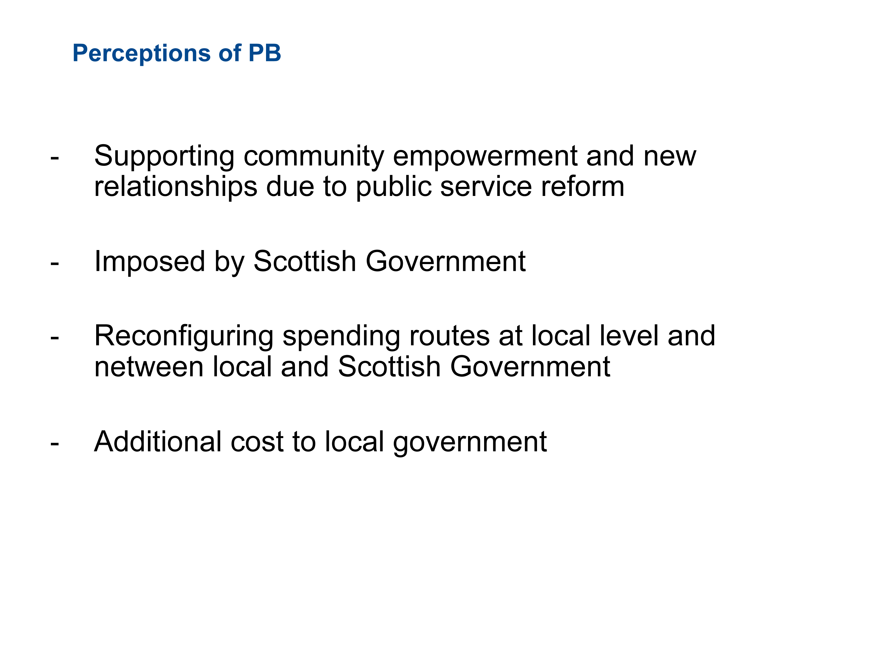 - Bruce Ryan: Angela O’Hagan says we need to recognise this variance, i.e. that we can’t assume everyone is signed up to PB. Hence there will be range of institutional resistances and facilitations in public bodies.