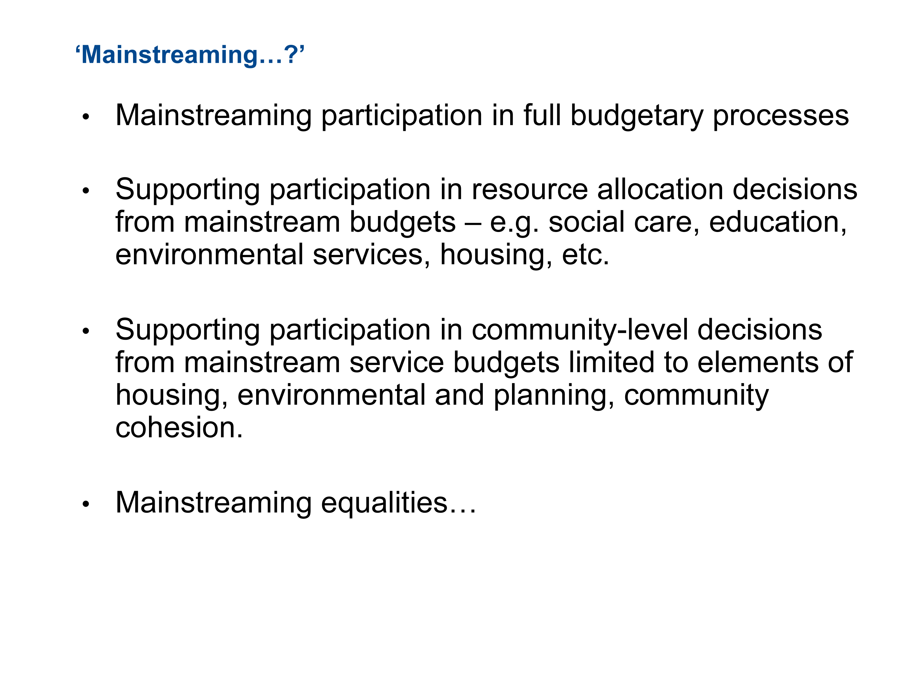- Bruce Ryan: Angela O’Hagan asks what is being mainstreamed: participation? decision-making? power-sharing? financial decision-making? participation in full range of local governance. Further questions in the slide: