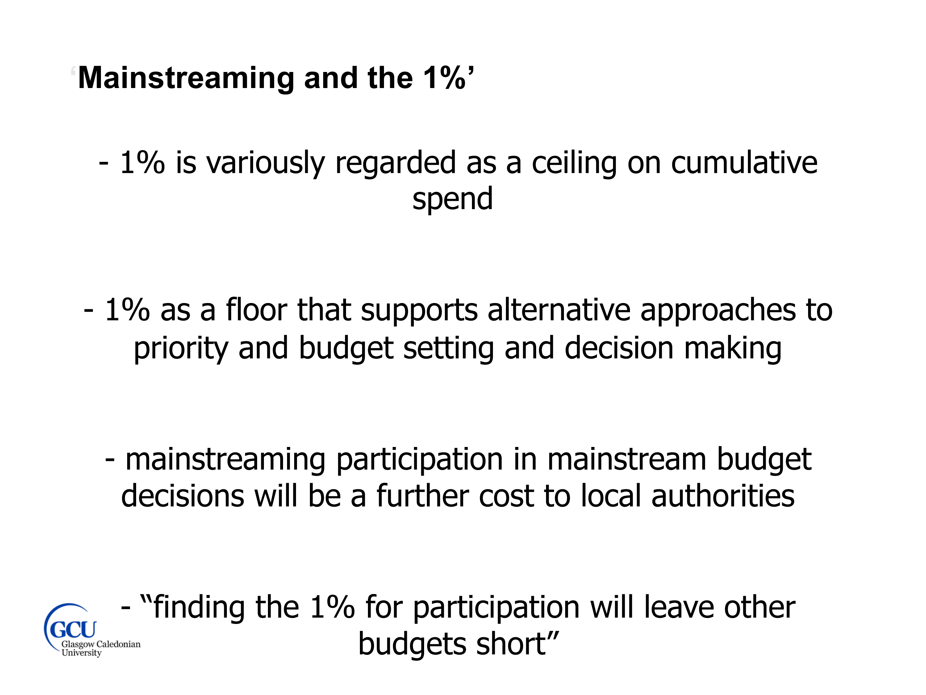 - Glasgow Disability: Angela O’Hagan preview of @GCUEquality 3 year evaluation of participatory budgeting in Scotland: #PBmainstream = participation in how mainstream budgets are allocated: social care, education, environment ? We hope so! #budget4equality to break the cycle of exclusion.