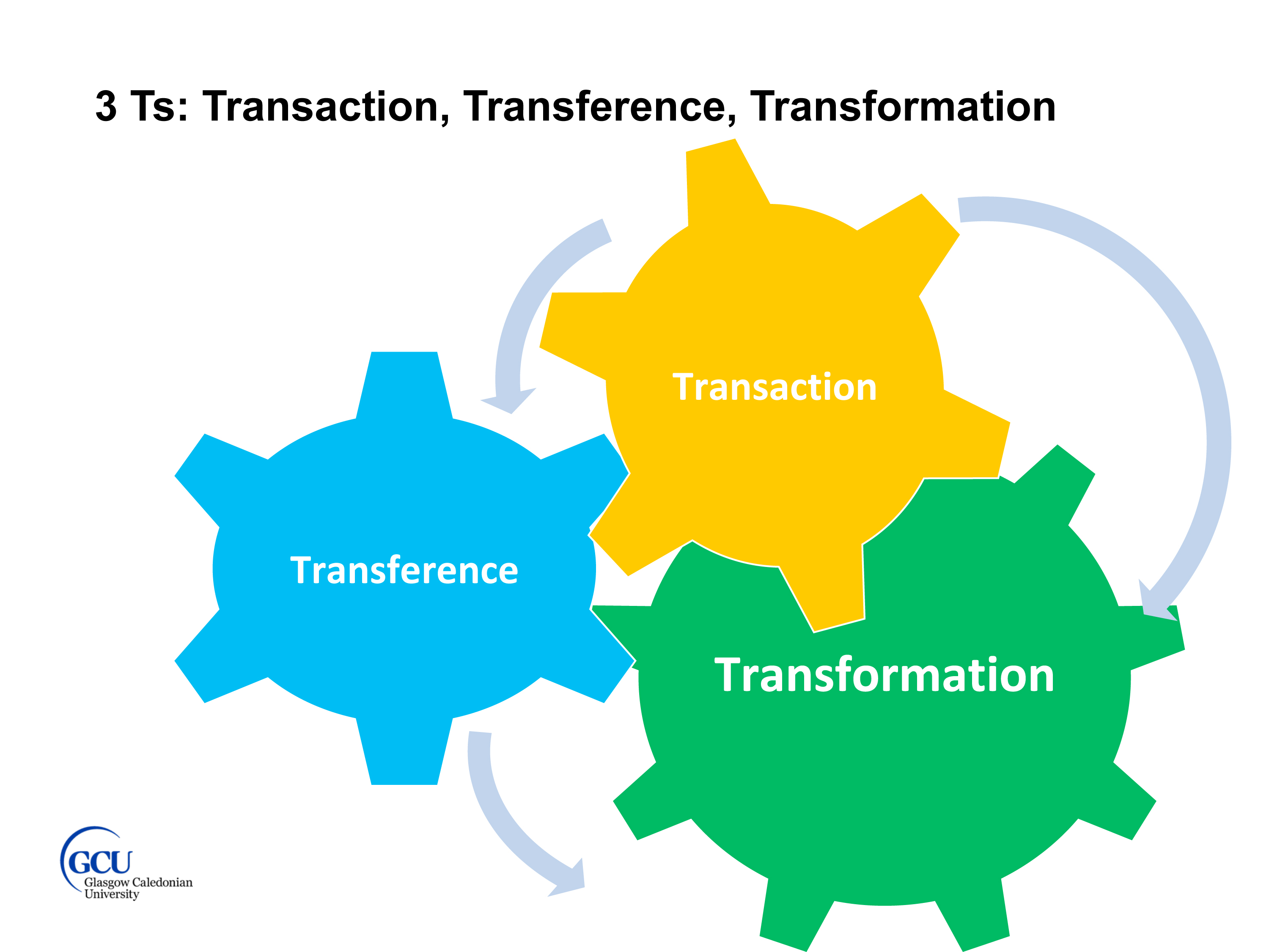 - Bruce Ryan: Angela O’Hagan says 3 there are Ts: transaction, transference, transformation. NB this is not a linear process.