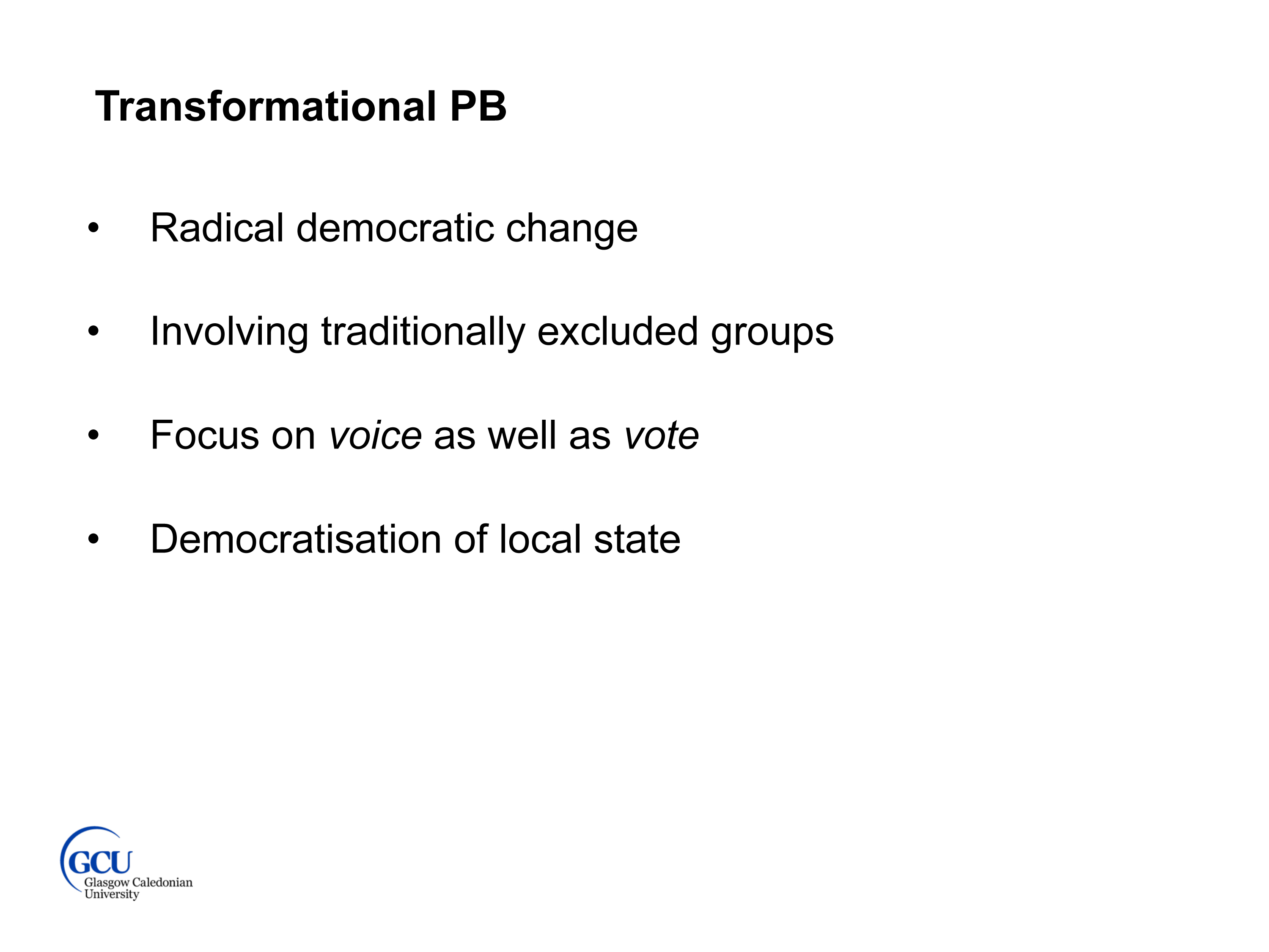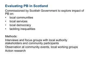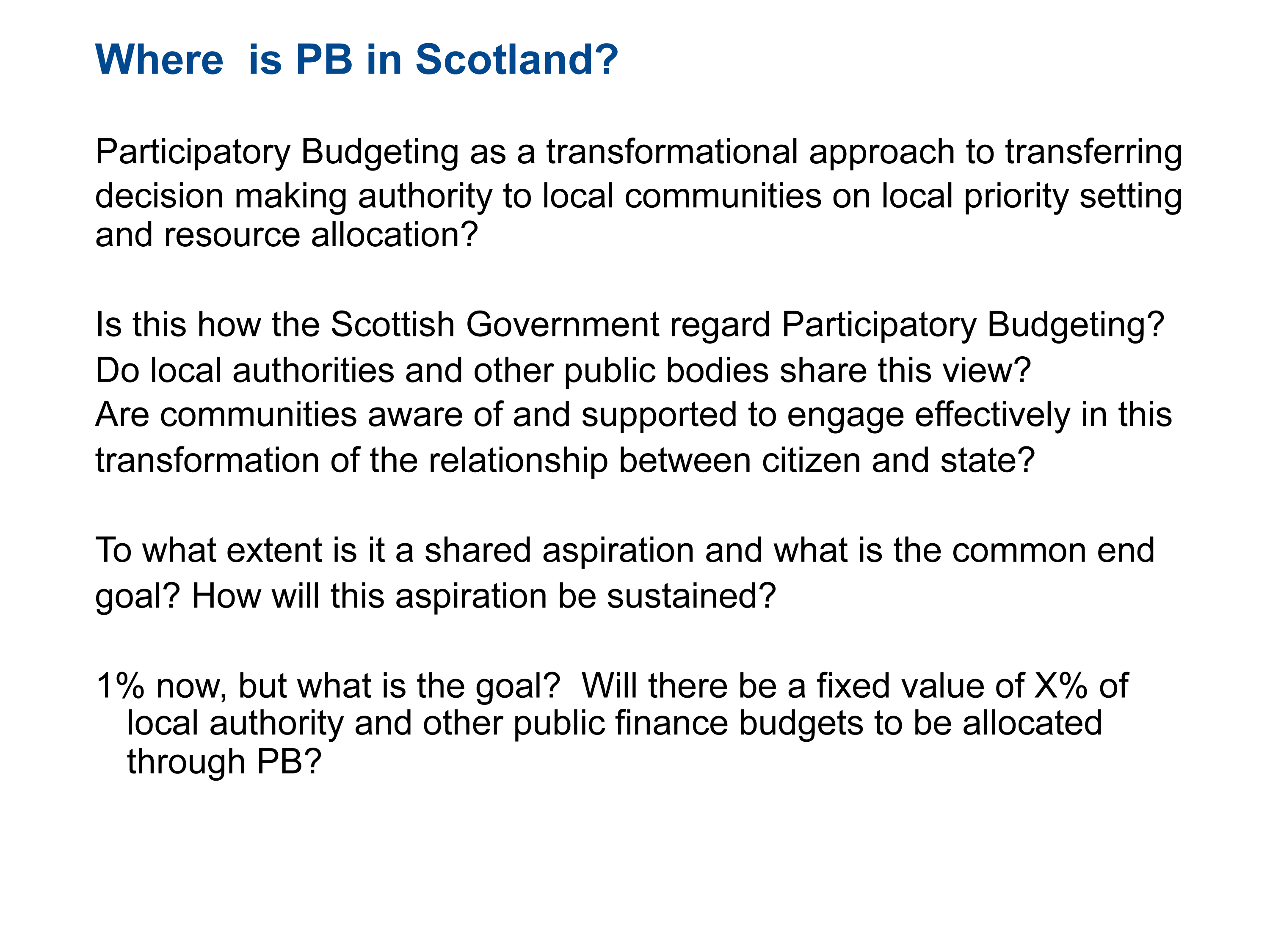 - Bruce Ryan: Angela O’Hagan asks whether PB is about/part of changing relationship between citizen and state? Transformational PB is about radical democratic change! Then asks where is PB in Scotland?
